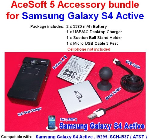 2x 3380mAh AceSoft Battery Home Wall Dock Travel Charger Micro USB Data Sync Cable Stand Hodler for AT&T Samsung Galaxy S4 Active i9295 SCH-I537 Phone Accessory