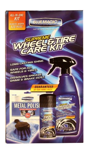The Blue Magic Supreme Wheel and Tire Care Kit provided everything you need to clean, shine, and polish wheels and tires all in one box. This 5-piece kit includes a 16-ounce spray bottle of wheel and tire cleaner, one 4-ounce bottle of supreme tire shine, one . 75-ounce packet of metal polish, one microfiber cloth, and a bristle wheel and tire brush. This kit is safe for use on all wheels and tires.