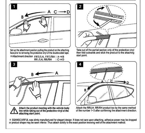 Installation process : 1. Before install, blow the strip with Sirocco from hairdryer for better adhesiveness. 2. Clean the application area with rubbing alcohol or water. 3. Remove the strip adhesive covering. 4. Apply the trim in the location. 5. Do not wash your car within 2~3 days after you stick.